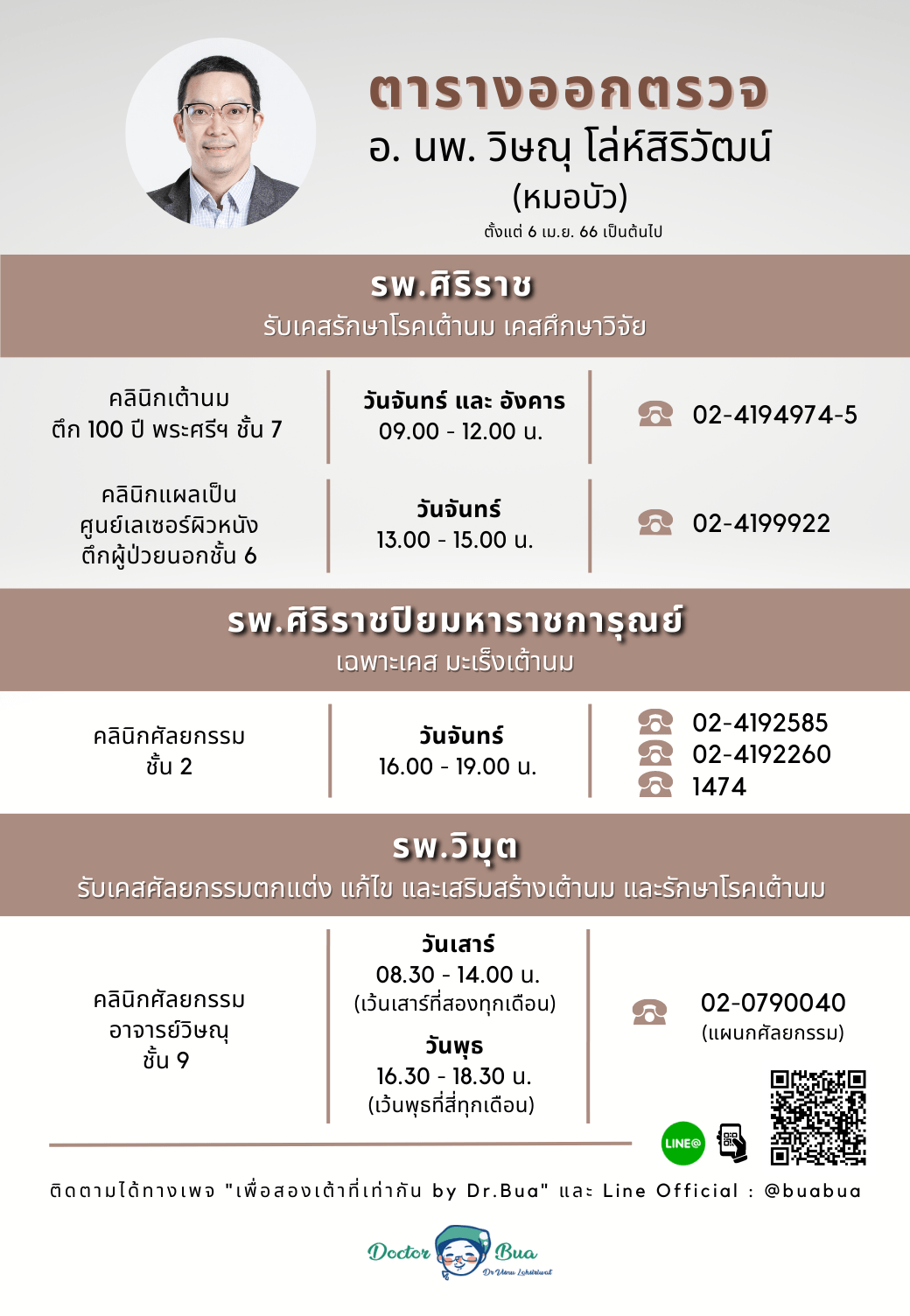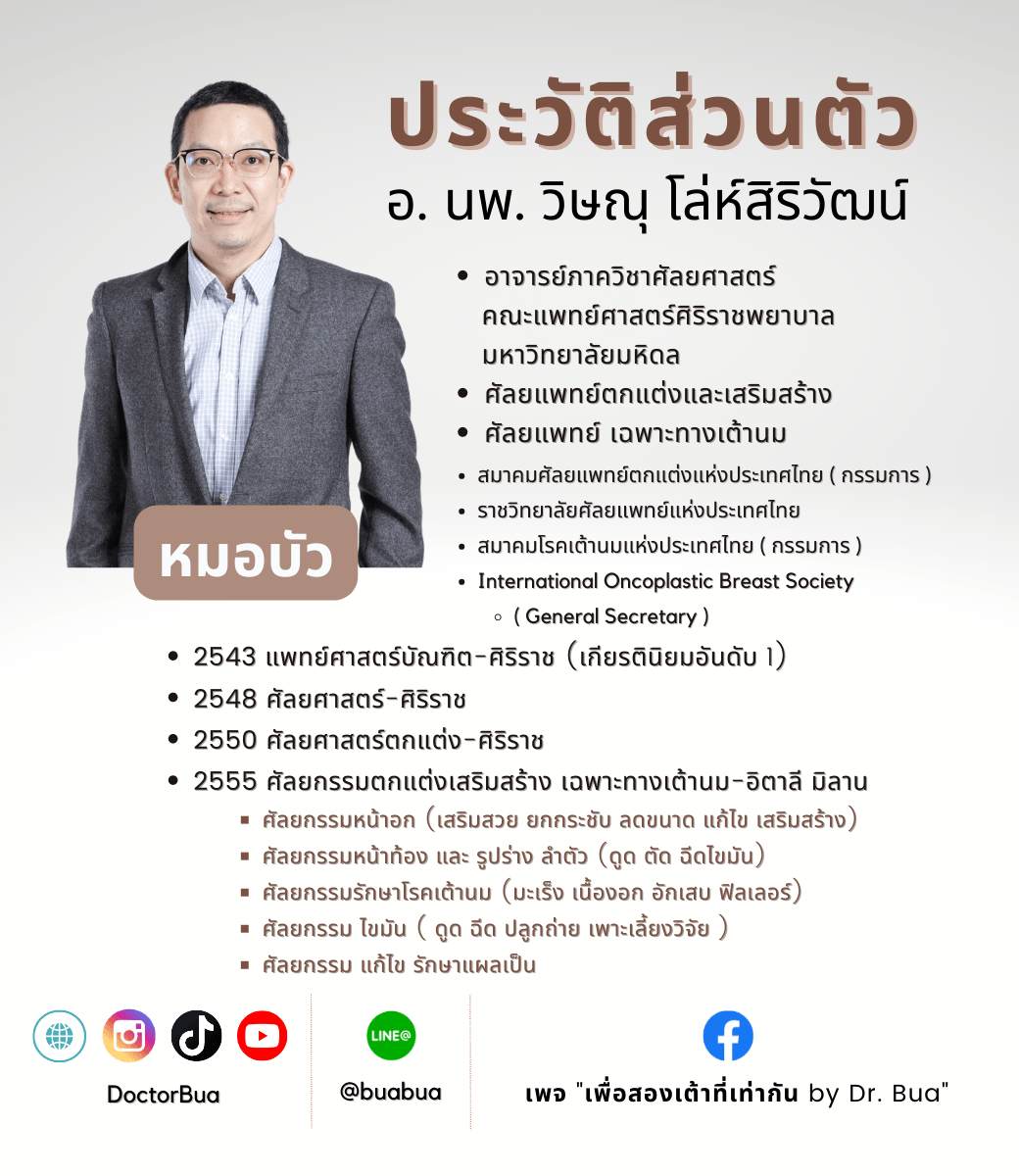 อาจารย์ นายแพทย์ วิษณุ โล่ห์สิริวัฒน์ (หมอบัว) อาจารย์ประจำภาควิชาศัลยศาสตร์ (ศิริราช) กรรมการสมาคมศัลยแพทย์ตกแต่งแห่งประเทศไทย เลขาธิการนานาชาติ International OncoPlastic Breast Society บรรณาธิการ วารสารวิชาการทั้งในและต่างประเทศ